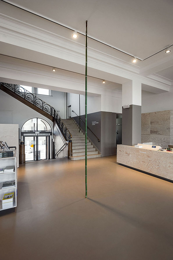 A work such as untitled regards walls, doors, and fixtures as factors that have to be integrated without elevating them to a special status. They are components of an environment onto which the work is ‘grafted’, so to speak, implying a break with the existing context, and its subsequent re-inscription. The wall remains a wall, but it becomes a punctured wall involuntarily supporting the work. Therefore, the question of what ultimately belongs to a work of art is raised – the canes, the wall, the context, the surroundings? This question is deliberately kept open, for Meier’s temporary implementation of the cane system in an institutional space is neither a direct critique of the institution nor an independent view of the installation’s intervention. Instead, the structure’s working character equally constitutes its material presence and graphic quality within the space – as well as its uninterested interaction with it. Hence, it is an art that quasi displays the conditions of its exhibition.
