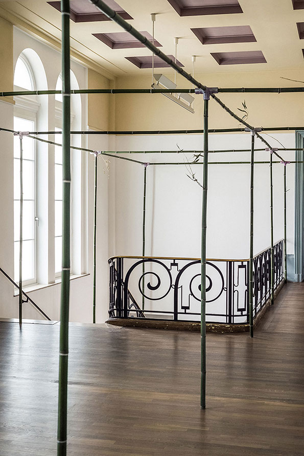 Meier’s untitled is a work situated between display and installation. The construction, made of bamboo canes and plugs, evokes conventional party tents and creates open, cubic forms, covering the bottom of the room with a grid-like structure. This structure intervenes with, and seems to respond to, the existing architecture. It meanders between the gallery space and the adjacent rooms; it is not interested in spatial hierarchies, in prioritising certain areas, or in the functional differentiation of architecture. It is ultimately a ‘meaningless’ structure that insists on its own presence without lending the space a functional surplus value or influencing its perception in a surprising way. As a minimalistic, disruptive factor it claims to be site-specific, although it is not. Other versions have already been displayed, among others, in Portland, Vienna, Braunschweig, Catania and New York, for as an easily transportable plug-in system, untitled ideally adapts to the most various circumstances by its polite ignorance of them. If there’s a wall in the way, it is drilled through, without further ado.