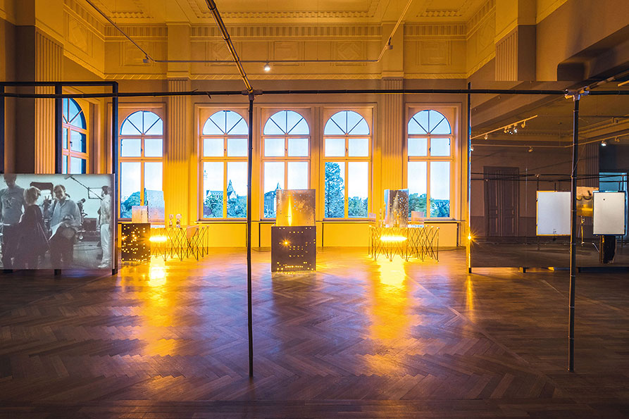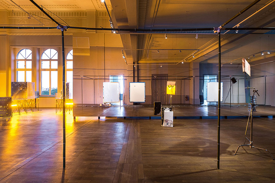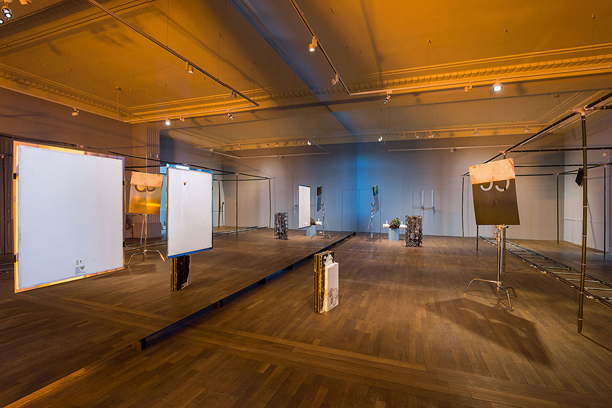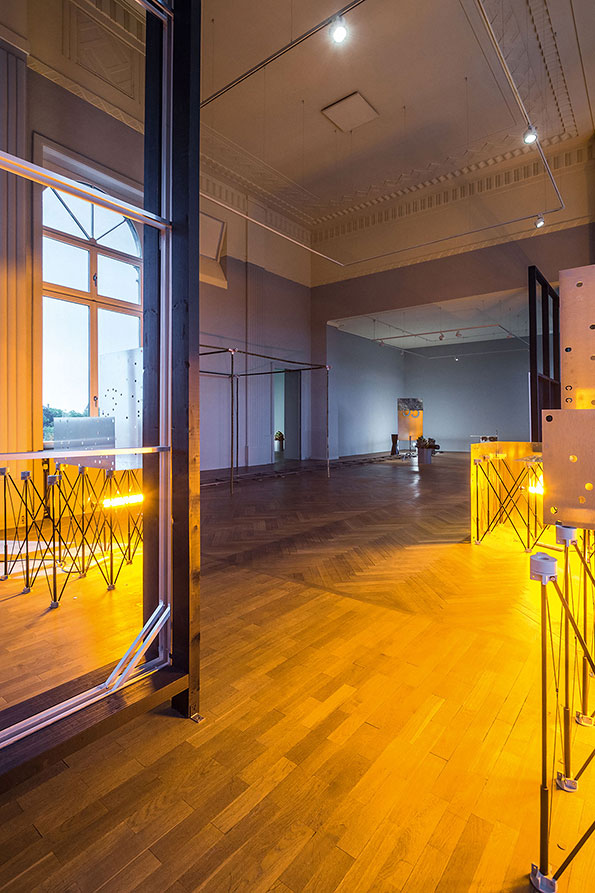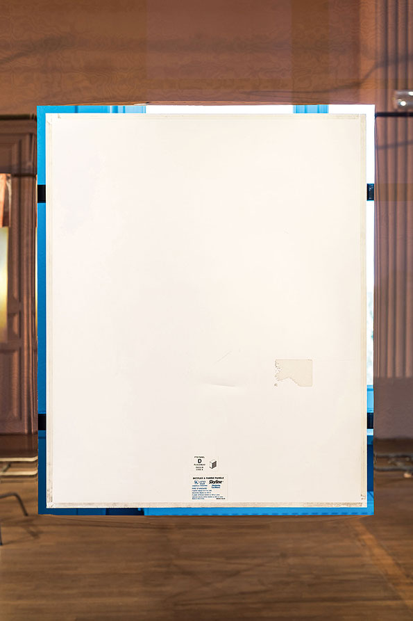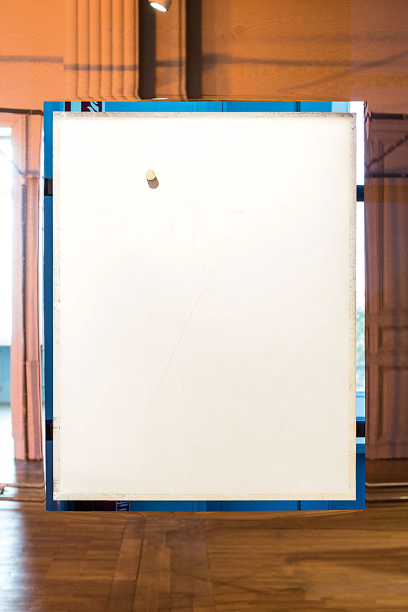 While untitled invades and uncompromisingly occupies the exhibition space, the other components of Meier’s exhibition unfold entirely outside the bamboo structure, engaging in a more symbiotic coexistence with the space that takes into account or even highlights its specificities. At Casino Luxembourg, Meier highlights the architectural context by negating or partly dissolving it. Entire sections of walls and facades are ‘pushed back’ thanks to a play with monumental mirrored surfaces. Wherever untitled comes up against the materiality of the architecture, or even physically passes through it, the floating walls create a sense of immateriality, as the building seems to become malleable and stretchable at will. The seriality and repetitiveness of the works is enhanced by their reflection in the mirrors. The mirrors do not occupy the whole space, ensuring that the artist’s gesture and the installative nature of his intervention remain visible. The meeting of the two realms – the point where the reflection becomes reality and the surface becomes space again – creates a field of tension. Rather than scenographic elements or effects, the reflective surfaces embody the intrinsic concepts of the artist’s work.