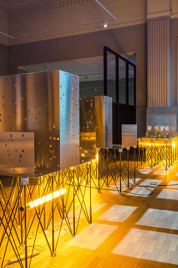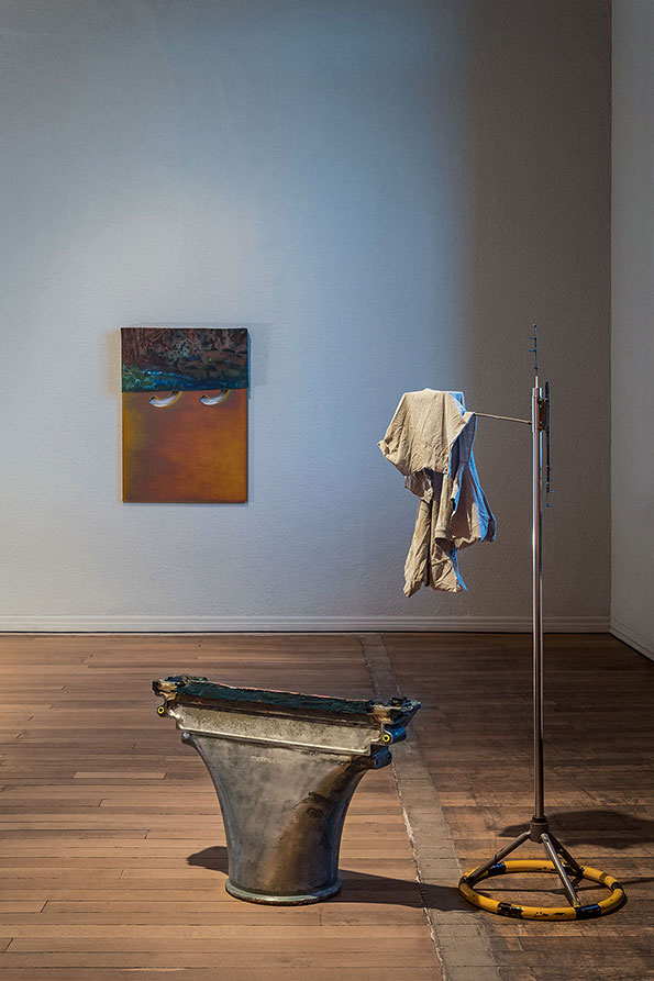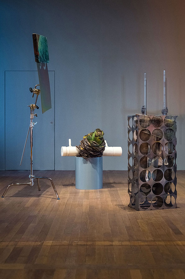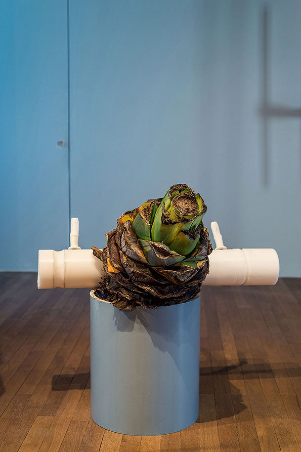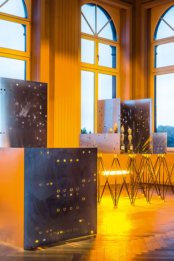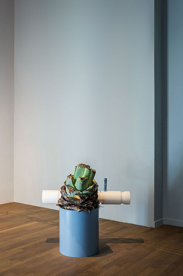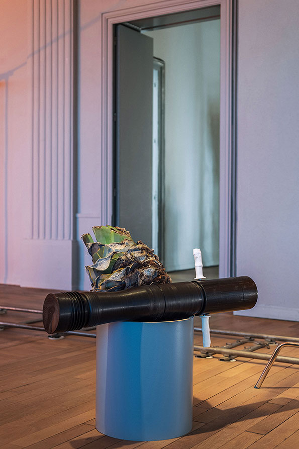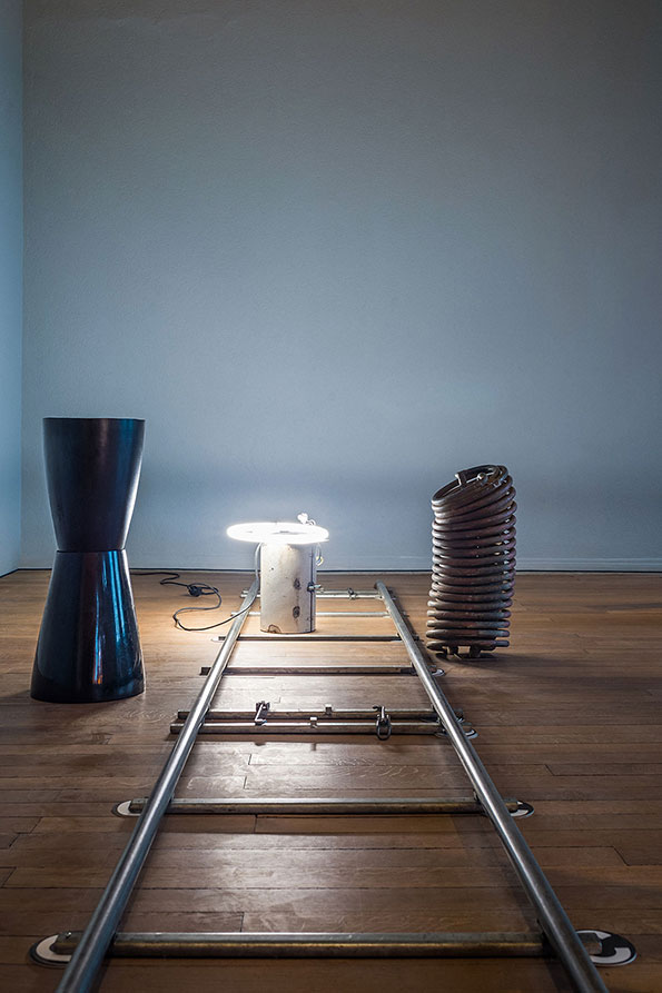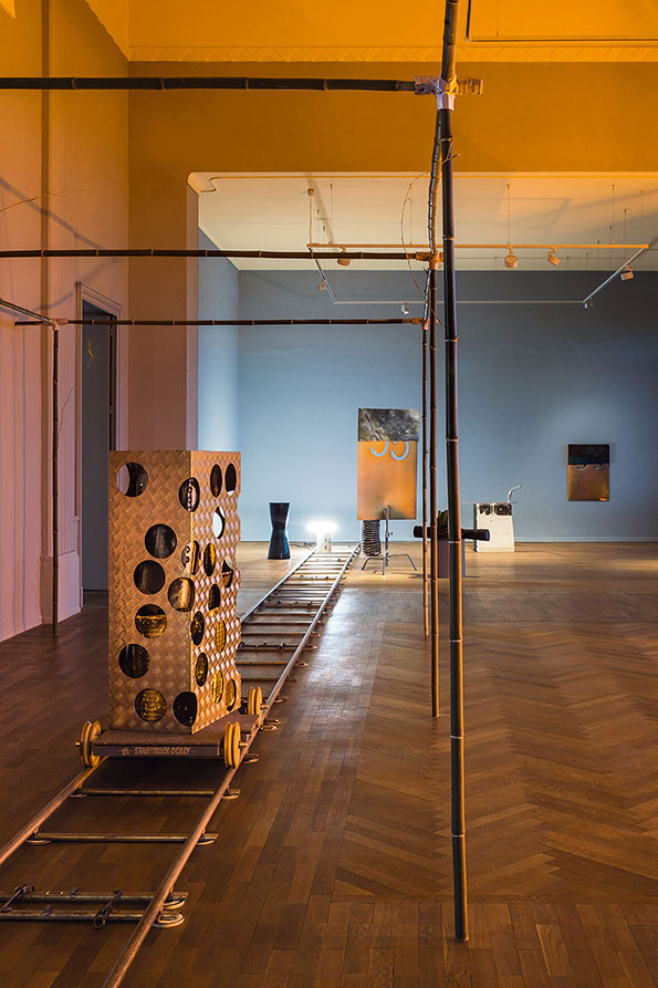 In the classical understanding of art, sculpture occupies the space statically: it is up to the viewer to move around the artwork and grasp its full extent while maintaining a certain distance, which acts as a sacred delimitation. Meier undermines this dogma and advocates instead a levelling of the sculptural hierarchy. By doing so, he aims to establish a different relationship between the viewer and his works, or even among viewers themselves. Doubt and hesitation in terms of transgressing conventional codes are an integral part of his approach, determining the relationships he is aiming to establish through his work. The exhibition space becomes a place for interaction and for questioning the potential of transformation induced by the functionality of some of the works’ components. Will the bottles be separated from their plinth/cap and release the mezcal they contain? Will the sculptures on mobile trolleys move along the twenty-six meters of rails on which they stand? Meier does not give answers to these questions, nor does he impose any definite form or reading of his exhibitions. Viewers may freely interpret the works as well as their relationships with the works and the exhibition space.