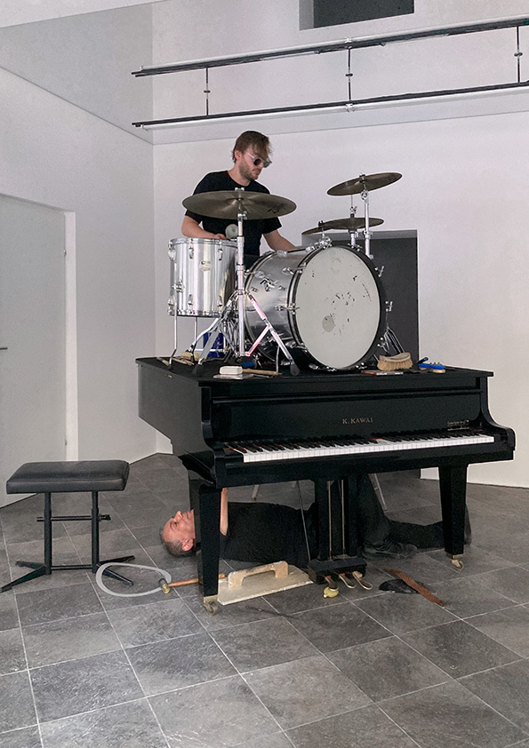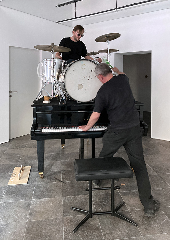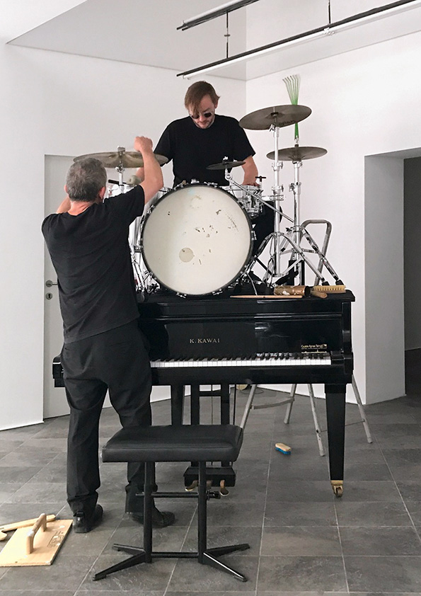 Over a period of 540 minutes Marino Formenti and Christoph Meier play the sculpture untitled (Band). From 11:00 to 20:00 the object consisting of a piano and a drum set performs. Afterwards, open bar.